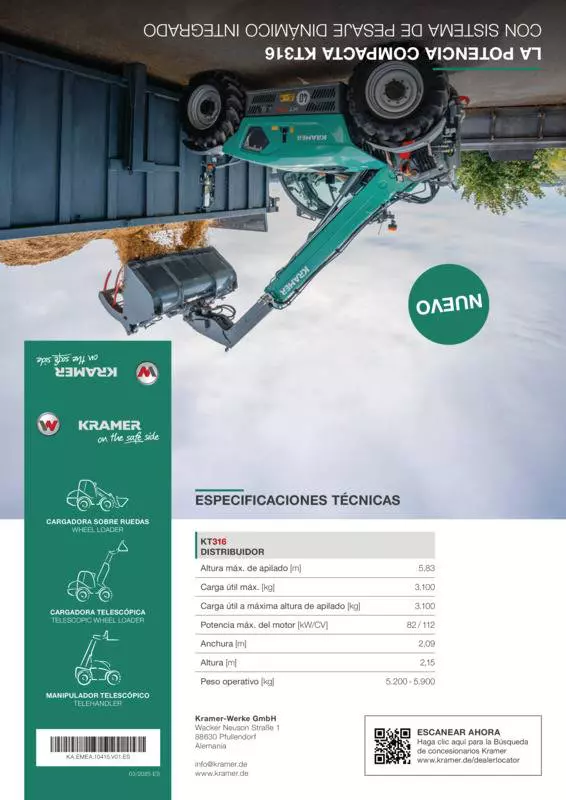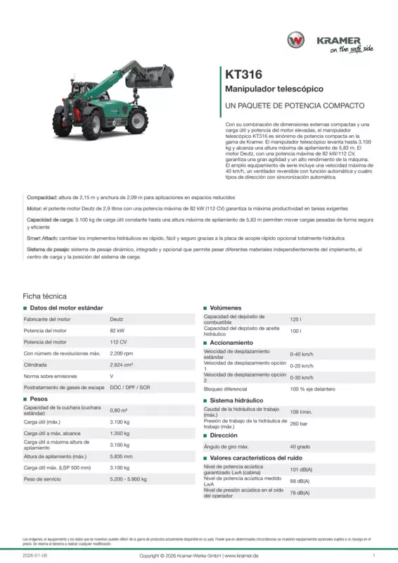 Con su combinación de dimensiones externas compactas y una carga útil y potencia del motor elevadas, el manipulador telescópico KT316 es sinónimo de potencia compacta en la gama de Kramer. El manipulador telescópico levanta hasta 3.100 kg y alcanza una altura máxima de apilamiento de 5,83 m. El motor Deutz, con una potencia máxima de 82 kW/112 CV, garantiza una gran agilidad y un alto rendimiento de la máquina. El amplio equipamiento de serie incluye una velocidad máxima de 40 km/h, un ventilador reversible con función automática y cuatro tipos de dirección con sincronización automática.