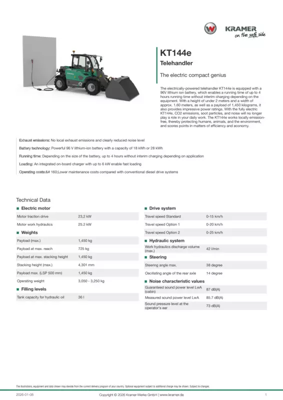 The electrically-powered telehandler KT144e is equipped with a 96V lithium ion battery, which enables a running time of up to 4 hours running time without interim charging depending on the equipment. With a height of under 2 meters and a width of approx. 1.60 meters, as well as a payload of 1,450 kilograms, it also provides impressive power ratings. With the fully electric KT144e, CO2 emissions, soot particles, and noise will no longer play a role in your daily work. The KT144e works locally emission-free, thereby protecting humans, animals, and the environment, and scores points in matters of efficiency and economy.