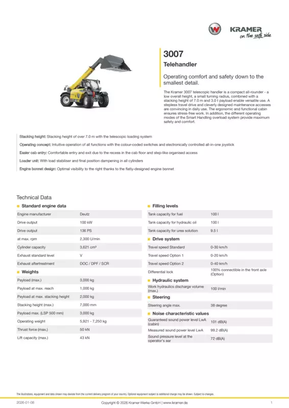 The Kramer 3007 telescopic handler is a compact all-rounder - a low overall height, a small turning radius, combined with a stacking height of 7.0 m and 3.0 t payload enable versatile use. A stepless travel drive and cleverly designed maintenance accesses are convincing in daily use. The ergonomic and functional cabin ensures stress-free work. In addition, the different operating modes of the Smart Handling overload system provide maximum safety and comfort.
