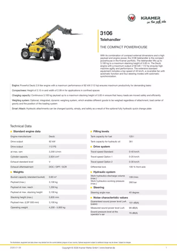 With its combination of compact external dimensions and a high payload and engine power, the 3106 telehandler is the compact powerhouse in the Kramer portfolio. The telehandler lifts up to 3,100 kg to a maximum stacking height of 5.83 m. The Deutz engine with a maximum output of 82 kW / 112 hp ensures high machine agility and performance. The extensive standard equipment includes a top speed of 40 km/h, a reversible fan with automatic function and four steering modes with automatic synchronization.
