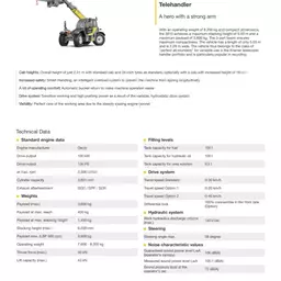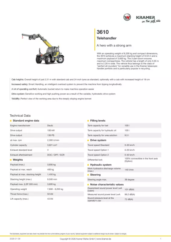 With an operating weight of 8,200 kg and compact dimensions, the 3610 achieves a maximum stacking height of 9.50 m and a maximum payload of 3,600 kg. The 3-part boom ensures maximum compactness. The vehicle has a length of only 5.03 m and is 2.28 m wide. The vehicle thus belongs to the class of "perfect all-rounders" for versatile use in the Kramer telescopic handler portfolio and is particularly popular in recycling.