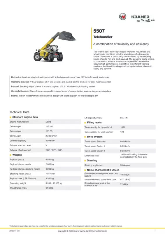 The Kramer 5507 telescopic loader offers the robustness of a wheel loader combined with the advantages of a telescopic loader. The model is particularly characterized by the stacking height of up to 7 m and 5.5 t payload. The powerful Deutz engine, in combination with the standard ecospeedPRO travel drive, ensures high performance. In addition, the different working modes of the Smart Handling overload system allow, above all, safety and comfort.