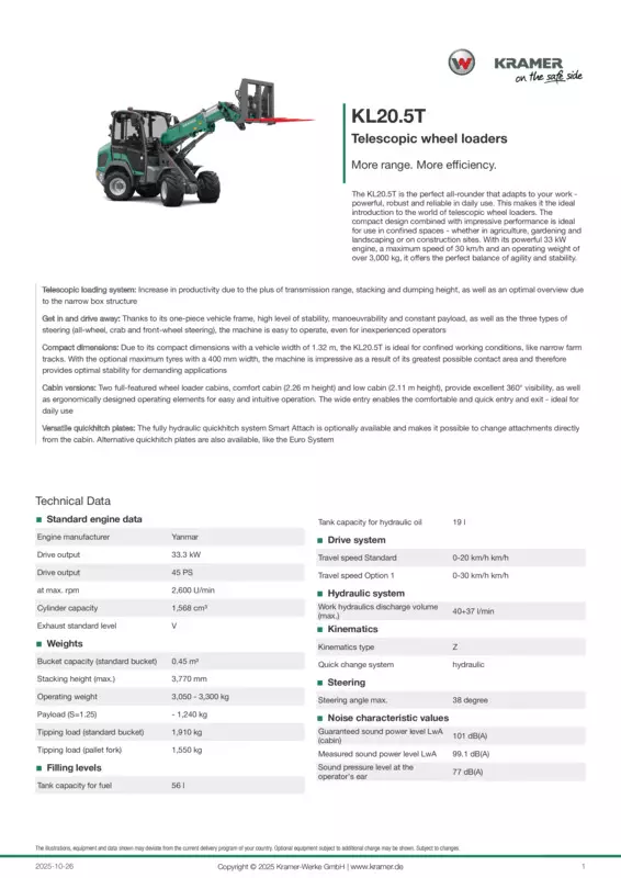 The KL20.5T is the perfect all-rounder that adapts to your work - powerful, robust and reliable in daily use. This makes it the ideal introduction to the world of telescopic wheel loaders. The compact design combined with impressive performance is ideal for use in confined spaces - whether in agriculture, gardening and landscaping or on construction sites. With its powerful 33 kW engine, a maximum speed of 30 km/h and an operating weight of over 3,000 kg, it offers the perfect balance of agility and stability.