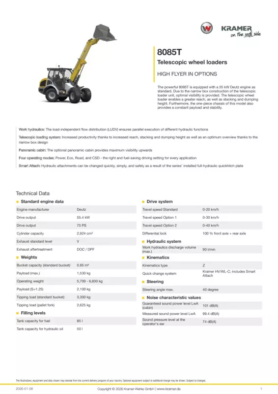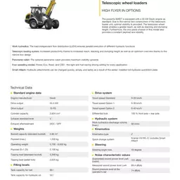 The powerful 8085T is equipped with a 55 kW Deutz engine as standard. Due to the narrow box construction of the telescopic loader unit, optimal visibility is provided. The telescopic wheel loader enables a greater reach, as well as stacking and dumping height. Furthermore, the one-piece chassis of this model also provides a constant payload and stability.