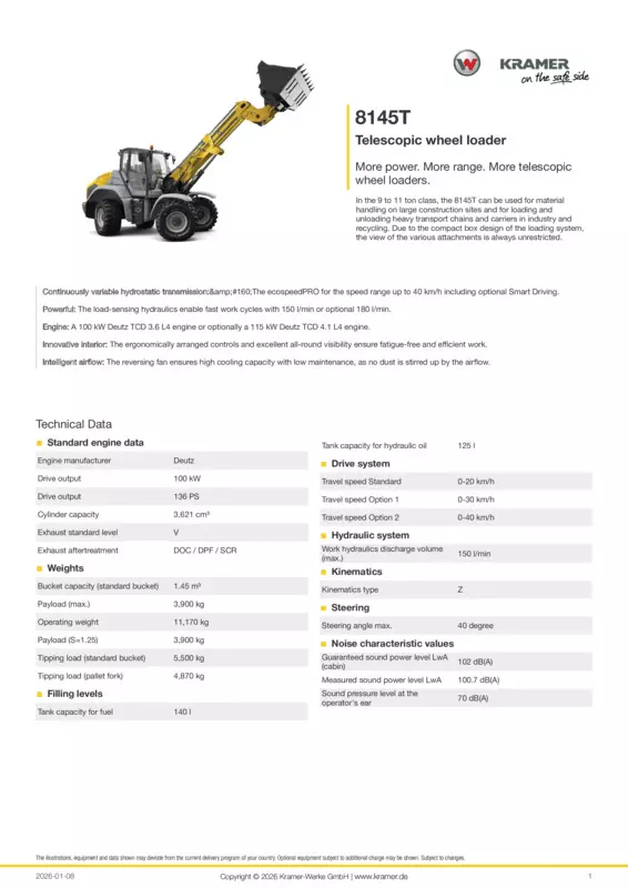 • Engine: A 100 kW Deutz TCD 3.6 L4 engine or optionally a 115 kW Deutz TCD 4.1 L4 engine.
