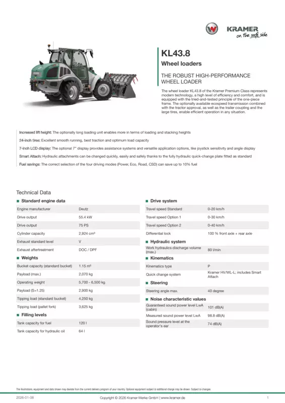 The wheel loader KL43.8 of the Kramer Premium Class represents modern technology, a high level of efficiency and comfort, and is equipped with the tried-and-tested principle of the one-piece frame. The optionally available ecospeed transmission combined with the tractor approval, as well as the trailer coupling and the large tires, enable efficient operation in any situation.