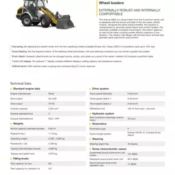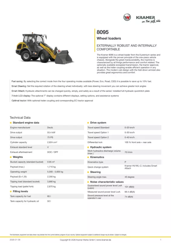 The Kramer 8095 is a wheel loader from the 8 premium series and is equipped with the proven principle of the one-piece vehicle chassis. Alongside the great maneuverability, the machine is characterized by all things performance and comfort related. The optionally available ecospeed transmission, the tractor approval, as well as the trailer coupling enable efficient operation in any situation. The modern cab design with the fold-down armrest also provides great ergonomics and comfort.