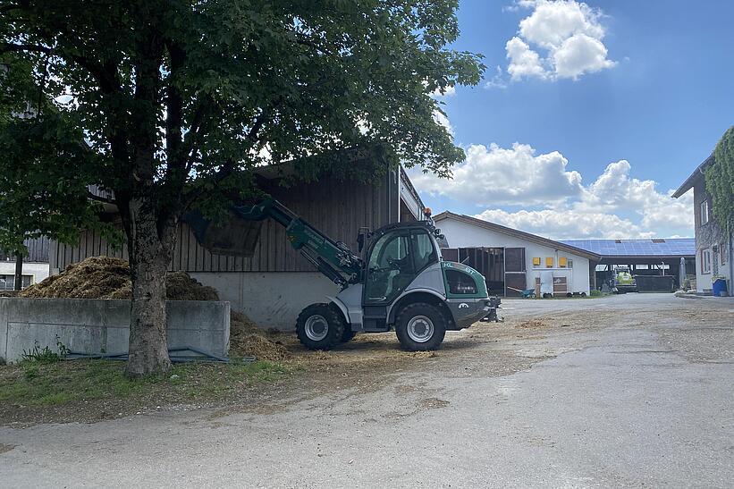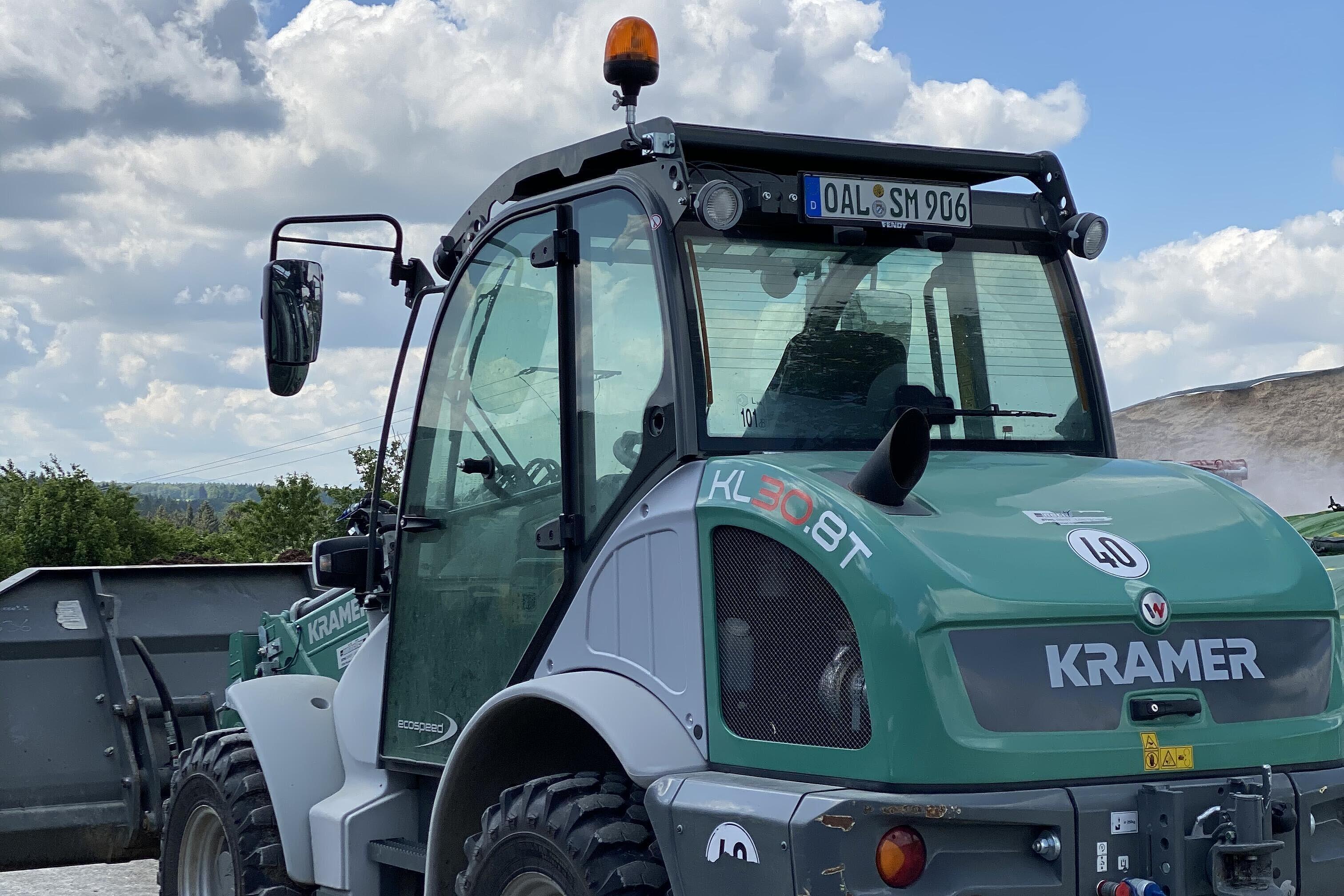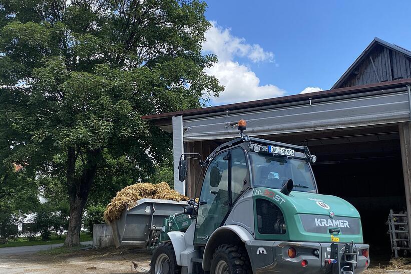 Avec l’aide de la fourche à palettes, d'un godet à matériaux légers ou d’autres équipements, les matériaux sont faciles à transporter sur la ferme de la famille Satzger, en toute sécurité et avec une stabilité optimale grâce aux quatre roues directrices caractéristiques de Kramer. Le remplissage de mélangeuses à fourrage ou d’installations en hauteur est également un jeu d’enfants pour la KL30.8T. Tous les avantages des machines Kramer : maniabilité rapide et sûre, largeur de machine optimale, mais aussi modes de direction flexibles pour manœuvrer idéalement le long des murs, sont ici déployés dans tout leur potentiel. Un avantage supplémentaire est la boîte de vitesses rapide Ecospeed pouvant atteindre une vitesse de 40 km/h. Le dispositif d'attelage associé à l’homologation tracteur correspondante (les deux en option) font de la KL30.8T un tracteur parfait. Cela permet de transporter des machines de travail, outils, matériaux ou équipements sur la voie publique pour atteindre le site d’intervention. La machine Kramer convainc ainsi totalement pour la manutention de marchandises dans des espaces exigus sur l’exploitation agricole de la famille Satzger.
