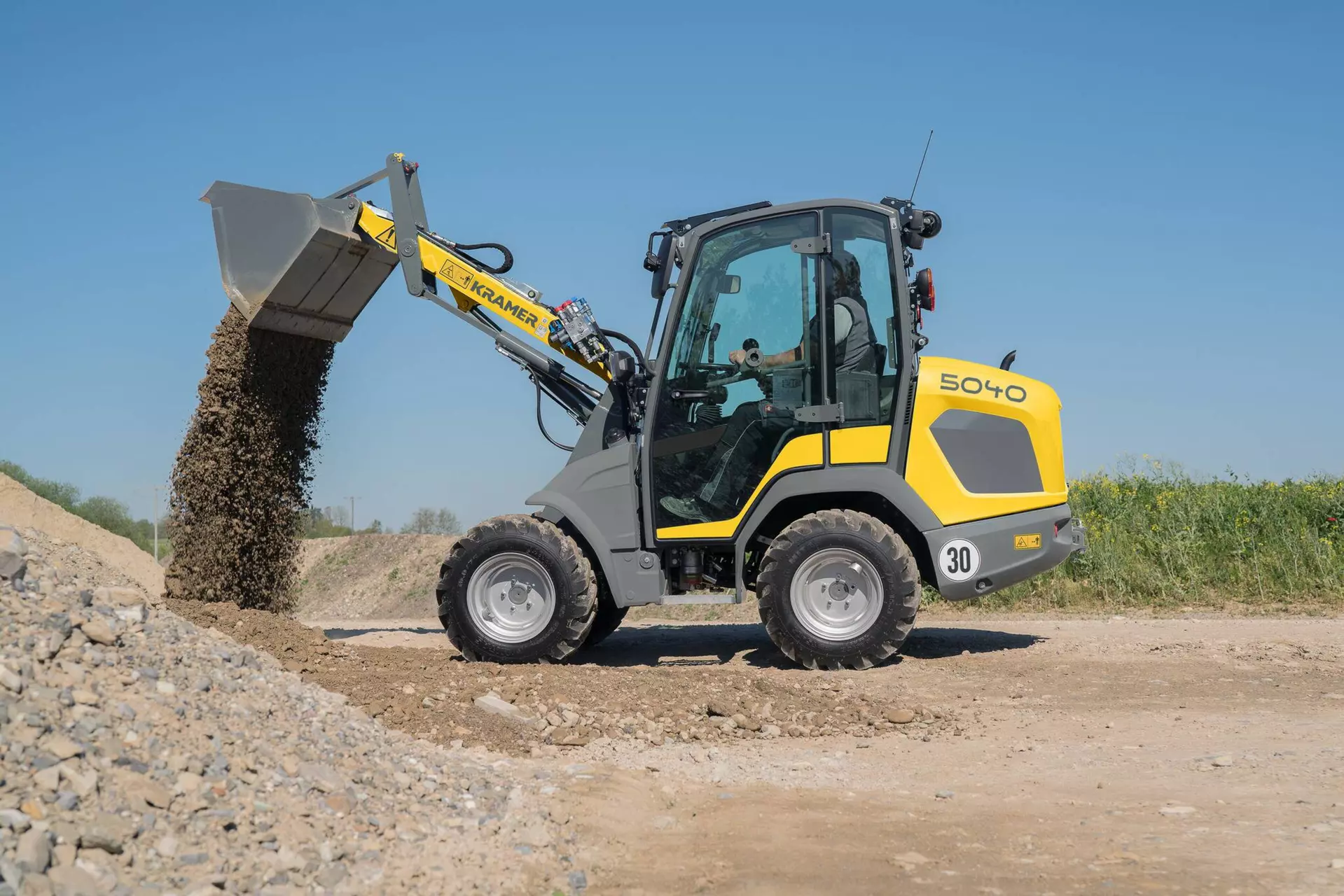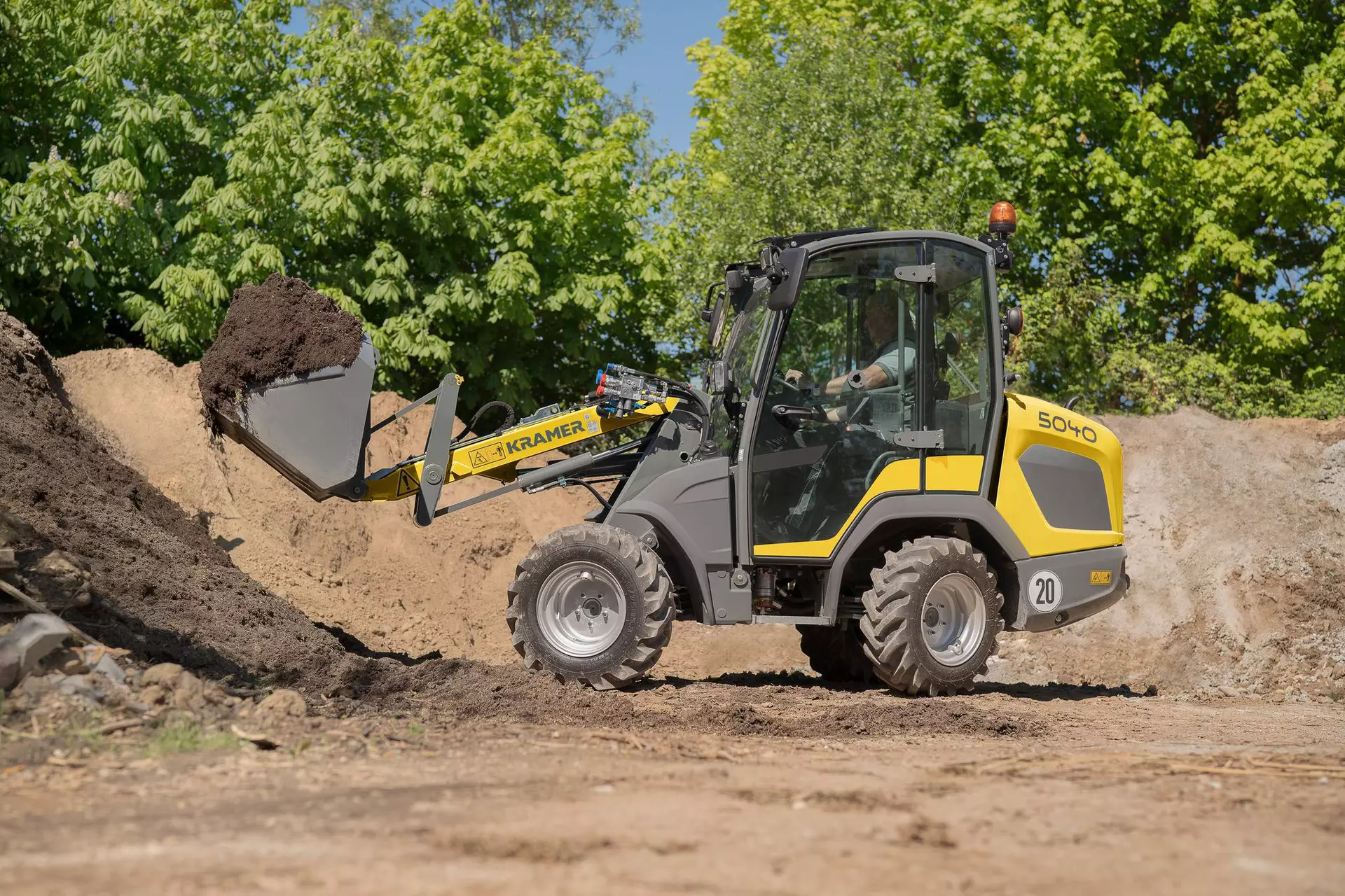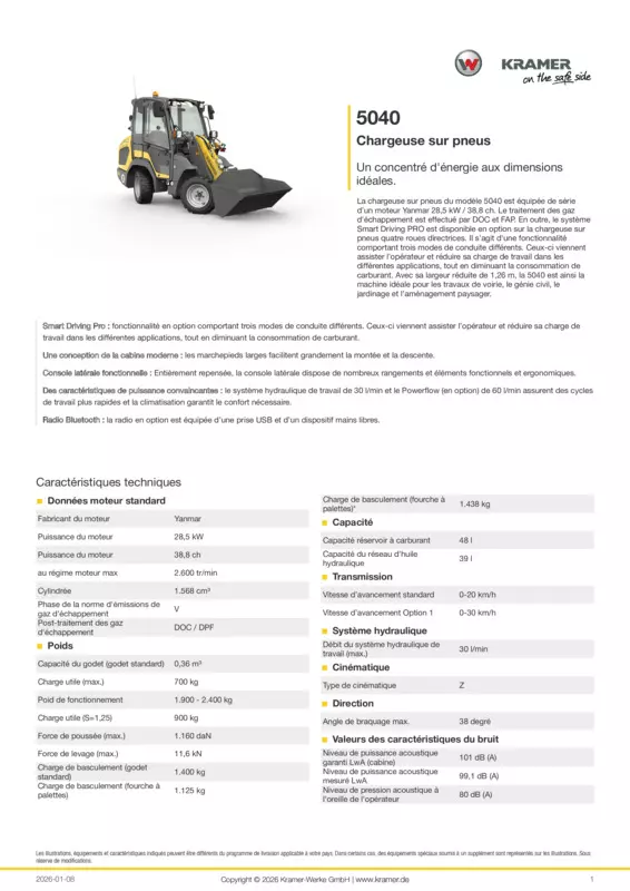 La chargeuse sur pneus du modèle 5040 est équipée de série d’un moteur Yanmar 28,5 kW / 38,8 ch. Le traitement des gaz d'échappement est effectué par DOC et FAP. En outre, le système Smart Driving PRO est disponible en option sur la chargeuse sur pneus quatre roues directrices. Il s'agit d'une fonctionnalité comportant trois modes de conduite différents. Ceux-ci viennent assister l’opérateur et réduire sa charge de travail dans les différentes applications, tout en diminuant la consommation de carburant. Avec sa largeur réduite de 1,26 m, la 5040 est ainsi la machine idéale pour les travaux de voirie, le génie civil, le jardinage et l’aménagement paysager.