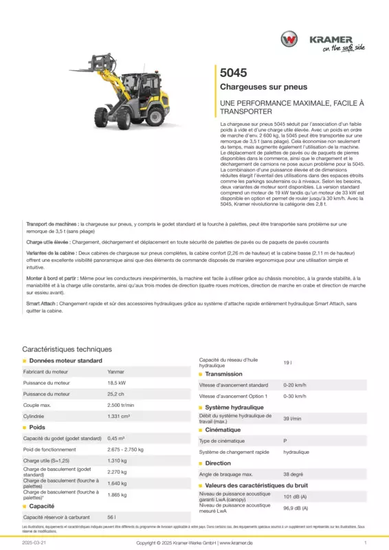 La chargeuse sur pneus 5045 séduit par l’association d’un faible poids à vide et d’une charge utile élevée. Avec un poids en ordre de marche d’env. 2 600 kg, la 5045 peut être transportée sur une remorque de 3,5 t (sans péage). Cela économise non seulement du temps, mais augmente également l’utilisation de la machine. Le déplacement de palettes de pavés ou de paquets de pierres disponibles dans le commerce, ainsi que le chargement et le déchargement de camions ne pose aucun problème pour la 5045. La combinaison d’une puissance élevée et de dimensions réduites élargit l’éventail des utilisations dans des espaces étroits comme les parkings souterrains ou à niveaux. Selon les besoins, deux variantes de moteur sont disponibles. La version standard comprend un moteur de 19 kW tandis qu’un moteur de 33 kW est disponible en option et permet de rouler jusqu’à 30 km/h. Avec la 5045, Kramer révolutionne la catégorie des 2,8 t.