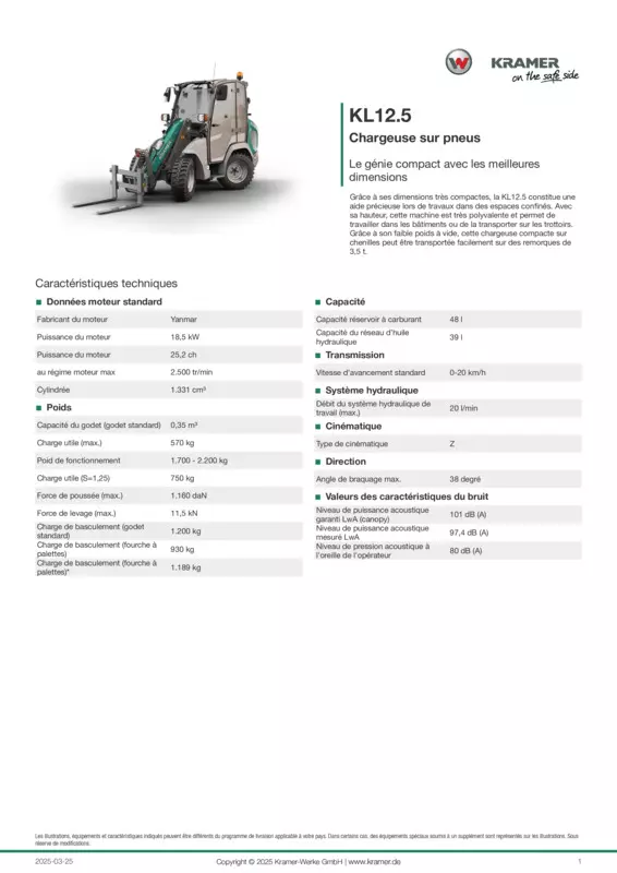 Grâce à ses dimensions très compactes, la KL12.5 constitue une aide précieuse lors de travaux dans des espaces confinés. Avec sa hauteur, cette machine est très polyvalente et permet de travailler dans les bâtiments ou de la transporter sur les trottoirs. Grâce à son faible poids à vide, cette chargeuse compacte sur chenilles peut être transportée facilement sur des remorques de 3,5 t.