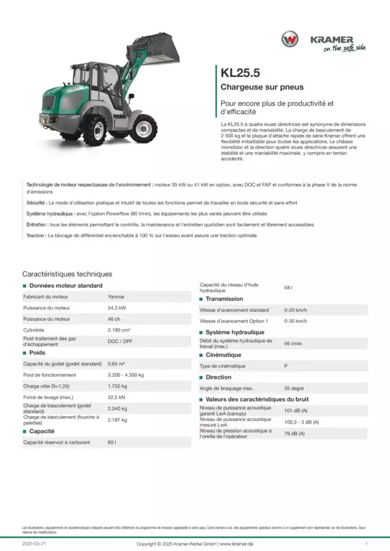 La KL25.5 à quatre roues directrices est synonyme de dimensions compactes et de maniabilité. La charge de basculement de 2 500 kg et la plaque d’attache rapide de série Kramer offrent une flexibilité imbattable pour toutes les applications. Le châssis monobloc et la direction quatre roues directrices assurent une stabilité et une maniabilité maximale, y compris en terrain accidenté.