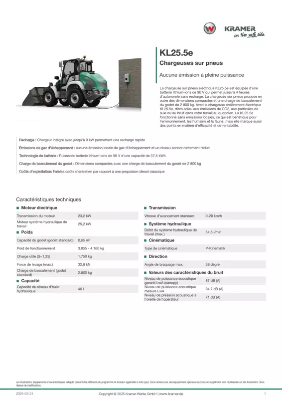 La chargeuse sur pneus électrique KL25.5e est équipée d’une batterie lithium-ions de 96 V qui permet jusqu’à 4 heures d’autonomie sans recharge. La chargeuse sur pneus propose en outre des dimensions compactes et une charge de basculement du godet de 2 800 kg. Avec la chargeuse entièrement électrique KL25.5e, dites adieu aux émissions de CO2, aux particules de suie ou au bruit dans votre travail au quotidien. La KL25.5e fonctionne sans émissions locales, ce qui est bénéfique pour l’environnement, les humains et la faune, mais elle marque aussi des points en matière d’efficacité et de rentabilité.