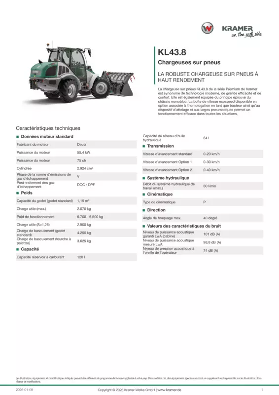 La chargeuse sur pneus KL43.8 de la série Premium de Kramer est synonyme de technologie moderne, de grande efficacité et de confort. Elle est également équipée du principe éprouvé du châssis monobloc. La boîte de vitesse ecospeed disponible en option associée à l’homologation en tant que tracteur ainsi qu’au dispositif d’attelage et aux larges pneumatiques permet un fonctionnement efficace dans toutes les situations.