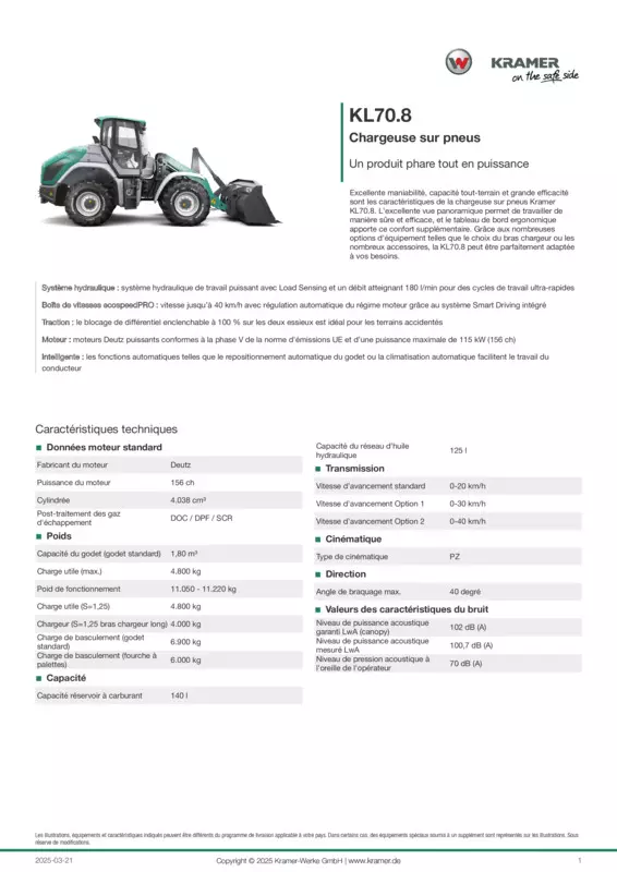 Excellente maniabilité, capacité tout-terrain et grande efficacité sont les caractéristiques de la chargeuse sur pneus Kramer KL70.8. L'excellente vue panoramique permet de travailler de manière sûre et efficace, et le tableau de bord ergonomique apporte ce confort supplémentaire. Grâce aux nombreuses options d'équipement telles que le choix du bras chargeur ou les nombreux accessoires, la KL70.8 peut être parfaitement adaptée à vos besoins.
