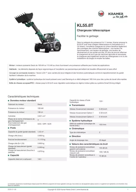 Dans la catégorie de puissance 9 à 11 tonnes, Kramer propose la KL55.8T avec bras chargeur télescopique et cinématique en Z. Ce faisant, l'excellente chargeuse sur pneus bénéficie également des avantages des chariots télescopiques : une hauteur de franchissement, une hauteur de gerbage, une hauteur de déversement et une portée accrues. En plus de pouvoir effectuer le chargement de tout type de machines agricoles et remorques, la chargeuse peut également remplir les mélangeuses à vis ou les installations de biogaz et empiler les balles.