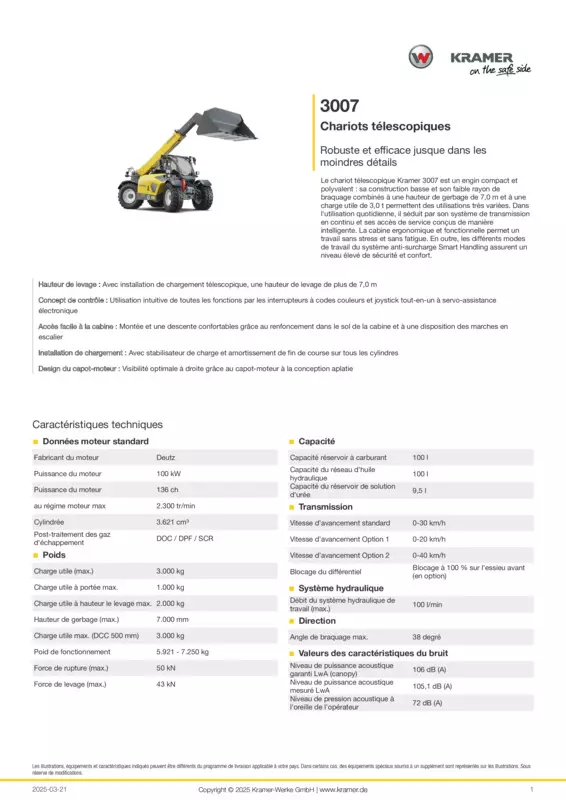 Le chariot télescopique Kramer 3007 est un engin compact et polyvalent : sa construction basse et son faible rayon de braquage combinés à une hauteur de gerbage de 7,0 m et à une charge utile de 3,0 t permettent des utilisations très variées. Dans l'utilisation quotidienne, il séduit par son système de transmission en continu et ses accès de service conçus de manière intelligente. La cabine ergonomique et fonctionnelle permet un travail sans stress et sans fatigue. En outre, les différents modes de travail du système anti-surcharge Smart Handling assurent un niveau élevé de sécurité et confort.