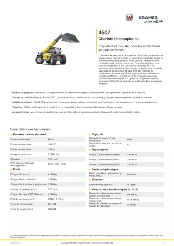 C'est dans les conditions de travail les plus dures que les chariots télescopiques Kramer mettent en valeur leurs capacités. Grâce au système hydraulique de travail Load Sensing, ils réalisent des cycles de travail rapides. Les accès d’entretien ingénieux, une force de levage de 4,5 t et une hauteur de levage de 7 m séduisent dans l’utilisation quotidienne. Le système de propulsion Ecospeed au couple élevé et agile offre des réserves de performance énormes et maîtrise également sans difficulté les conditions difficiles. Le faible rayon de braquage, grâce aux quatre roues directrices et aux cycles de chargement rapides, augmente l'efficacité sur chantier, en particulier dans les espaces restreints.