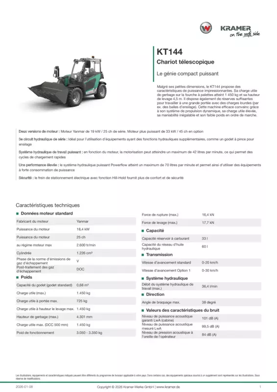 Malgré ses petites dimensions, le KT144 propose des caractéristiques de puissance impressionnantes. Sa charge utile de gerbage sur la fourche à palettes atteint 1 450 kg et sa hauteur de levage 4,5 m. Il dispose également de réserves suffisantes pour travailler à une grande portée avec des charges lourdes (par ex. des balles d’ensilage). Cette machine efficace convainc grâce à son système de propulsion dynamique, sa charge utile élevée, sa maniabilité inégalable et son faible poids en ordre de marche.