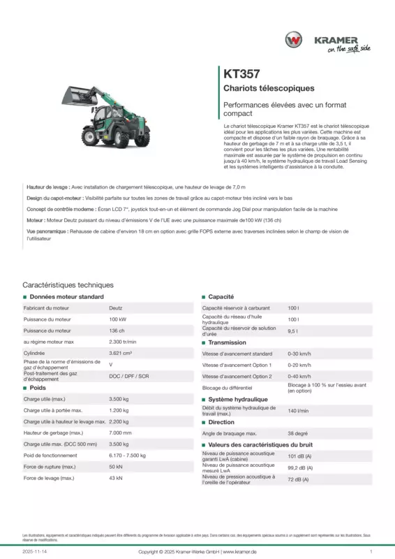 Le chariot télescopique Kramer KT357 est le chariot télescopique idéal pour les applications les plus variées. Cette machine est compacte et dispose d'un faible rayon de braquage. Grâce à sa hauteur de gerbage de 7 m et à sa charge utile de 3,5 t, il convient pour les tâches les plus variées. Une rentabilité maximale est assurée par le système de propulsion en continu jusqu'à 40 km/h, le système hydraulique de travail Load Sensing et les systèmes intelligents d'assistance à la conduite.