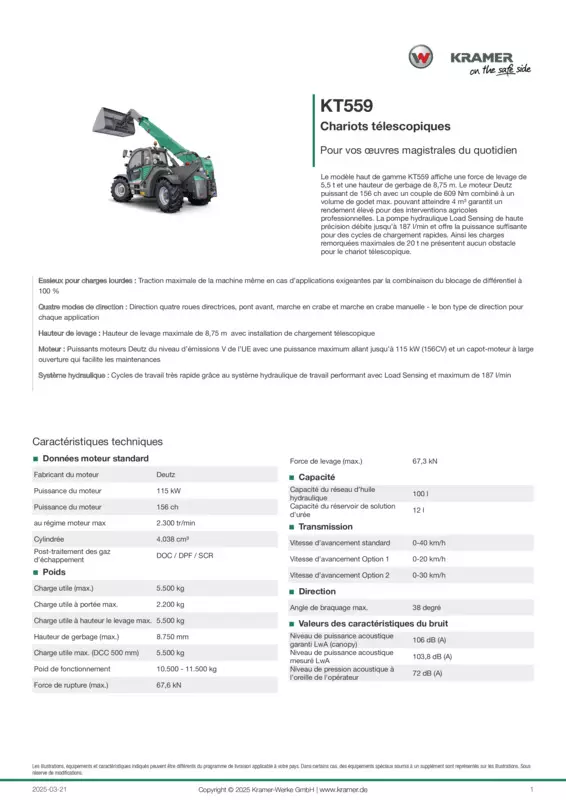 Le modèle haut de gamme KT559 affiche une force de levage de 5,5 t et une hauteur de gerbage de 8,75 m. Le moteur Deutz puissant de 156 ch avec un couple de 609 Nm combiné à un volume de godet max. pouvant atteindre 4 m³ garantit un rendement élevé pour des interventions agricoles professionnelles. La pompe hydraulique Load Sensing de haute précision débite jusqu’à 187 l/min et offre la puissance suffisante pour des cycles de chargement rapides. Ainsi les charges remorquées maximales de 20 t ne présentent aucun obstacle pour le chariot télescopique.