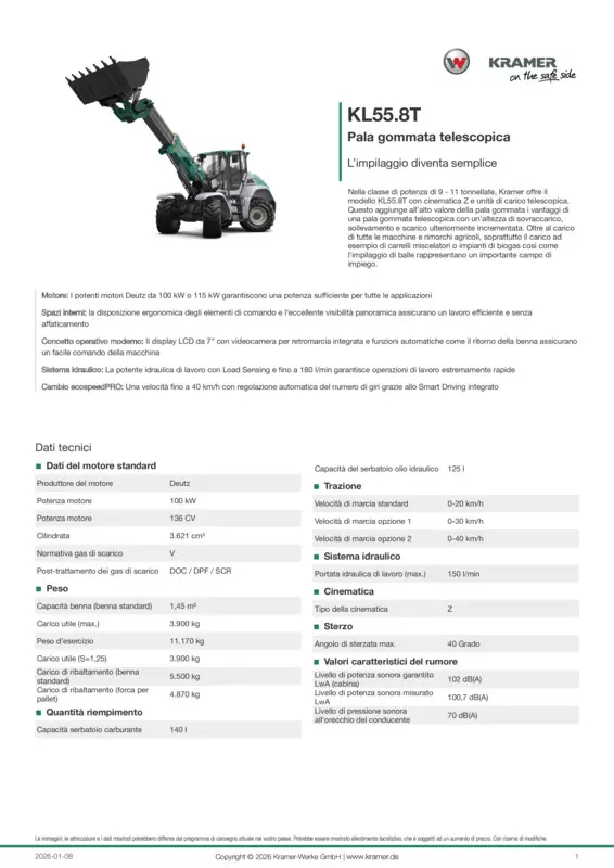 Nella classe di potenza di 9 - 11 tonnellate, Kramer offre il modello KL55.8T con cinematica Z e unità di carico telescopica. Questo aggiunge all'alto valore della pala gommata i vantaggi di una pala gommata telescopica con un'altezza di sovraccarico, sollevamento e scarico ulteriormente incrementata. Oltre al carico di tutte le macchine e rimorchi agricoli, soprattutto il carico ad esempio di carrelli miscelatori o impianti di biogas così come l'impilaggio di balle rappresentano un importante campo di impiego.