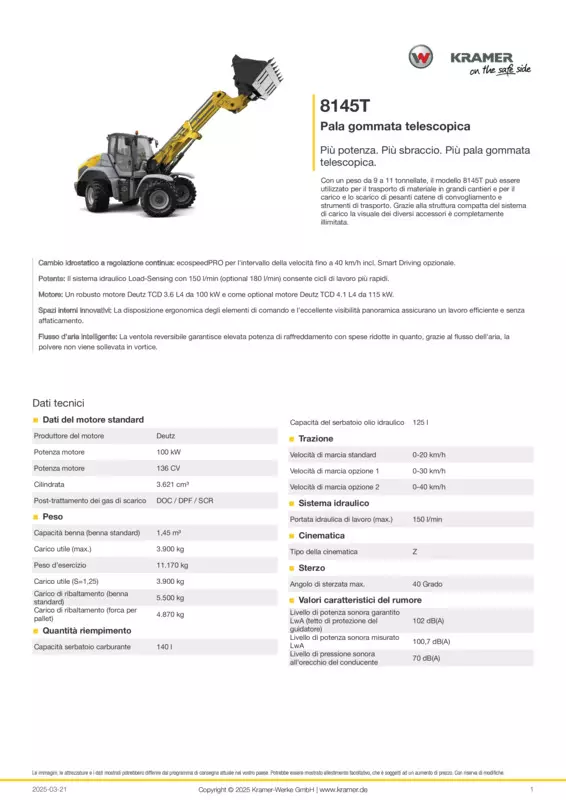 Con un peso da 9 a 11 tonnellate, il modello 8145T può essere utilizzato per il trasporto di materiale in grandi cantieri e per il carico e lo scarico di pesanti catene di convogliamento e strumenti di trasporto. Grazie alla struttura compatta del sistema di carico la visuale dei diversi accessori è completamente illimitata.