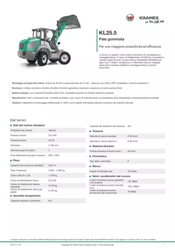 La KL25.5 a quattro ruote motrici è sinonimo di compattezza e maneggevolezza. Il carico di ribaltamento di 2500 kg e la piastra a cambio rapido Kramer di serie offrono flessibilità imbattibile per ogni l'uso. Il telaio monoblocco e l’affermata trazione integrale assicurano massima stabilità e maneggevolezza su terreni sconnessi.