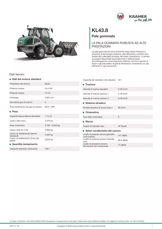 La pala gommata KL43.8 di Kramer della classe Premium è sinonimo di tecnologia moderna, alta efficienza e comfort ed è dotata del collaudato principio del telaio monoblocco. Il cambio ecospeed disponibile opzionalmente in abbinamento all'omologazione come macchina trattrice, nonché il gancio di traino e gli pneumatici di grandi dimensioni consentono un uso efficiente in ogni situazione.