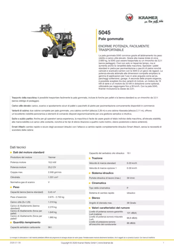La pala gommata 5045 convince grazie all'abbinamento tra peso ridotto e carico utile elevato. Grazie alla massa totale di circa 2.600 kg, la 5045 può essere trasportata su un rimorchio da 3,5 t (senza pedaggio). Così non solo si risparmia tempo, ma si aumenta anche la versatilità della macchina. Spostare i pallet standard in pietra per pavimentazione o pacchi di pietra nonché caricare e scaricare camion con la 5045 è un gioco da ragazzi. La potenza elevata abbinata alle dimensioni compatte ampliano la gamma di applicazioni per l'uso in aree anguste come ad es. parcheggi sotterranei, garage. A seconda delle proprie esigenze, è possibile scegliere tra due varianti di motore, un motore da 19 kW di serie e un motore da 33 kW in dotazione come optional, utilizzabile per raggiungere fino a 30 km/h. Con la pala 5045, Kramer rivoluziona la classe da 2,8 t.