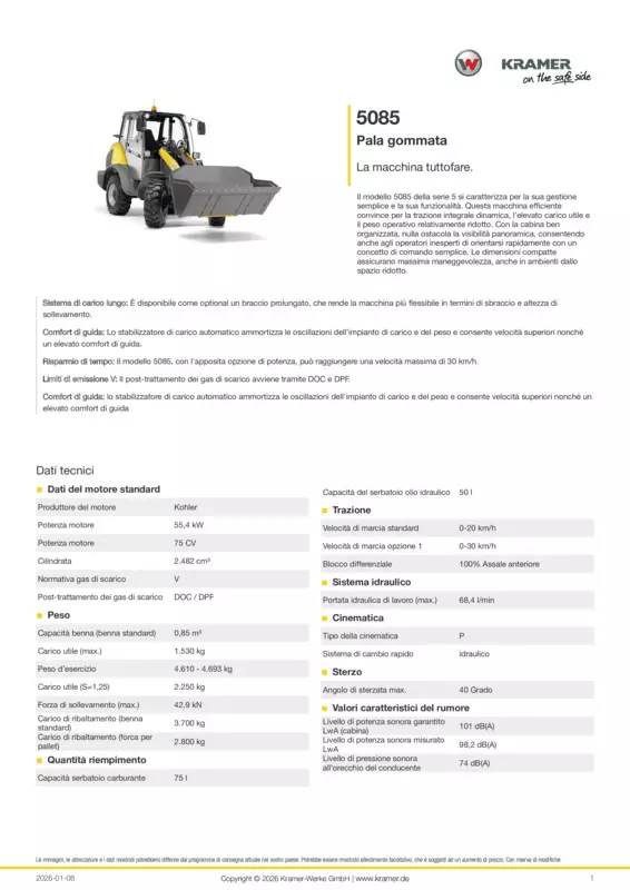 Il modello 5085 della serie 5 si caratterizza per la sua gestione semplice e la sua funzionalità. Questa macchina efficiente convince per la trazione integrale dinamica, l’elevato carico utile e il peso operativo relativamente ridotto. Con la cabina ben organizzata, nulla ostacola la visibilità panoramica, consentendo anche agli operatori inesperti di orientarsi rapidamente con un concetto di comando semplice. Le dimensioni compatte assicurano massima maneggevolezza, anche in ambienti dallo spazio ridotto.