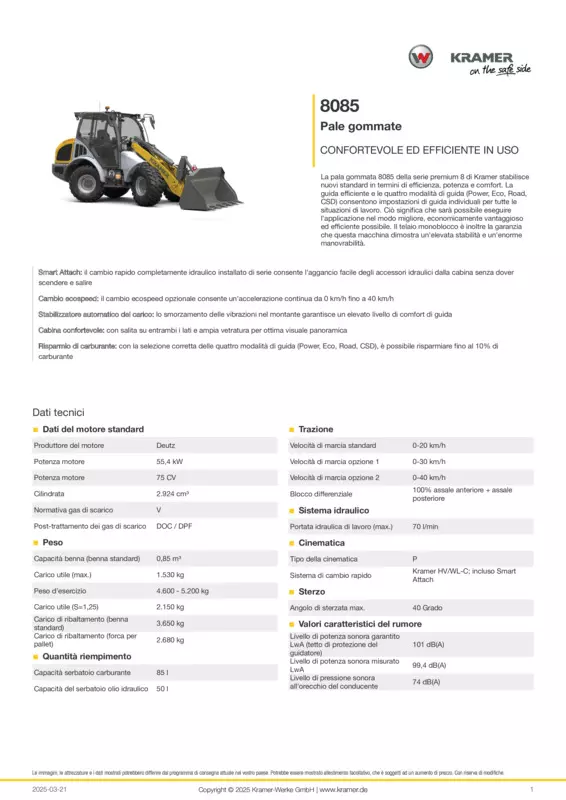 La pala gommata 8085 della serie premium 8 di Kramer stabilisce nuovi standard in termini di efficienza, potenza e comfort. La guida efficiente e le quattro modalità di guida (Power, Eco, Road, CSD) consentono impostazioni di guida individuali per tutte le situazioni di lavoro. Ciò significa che sarà possibile eseguire l'applicazione nel modo migliore, economicamente vantaggioso ed efficiente possibile. Il telaio monoblocco è inoltre la garanzia che questa macchina dimostra un'elevata stabilità e un'enorme manovrabilità.