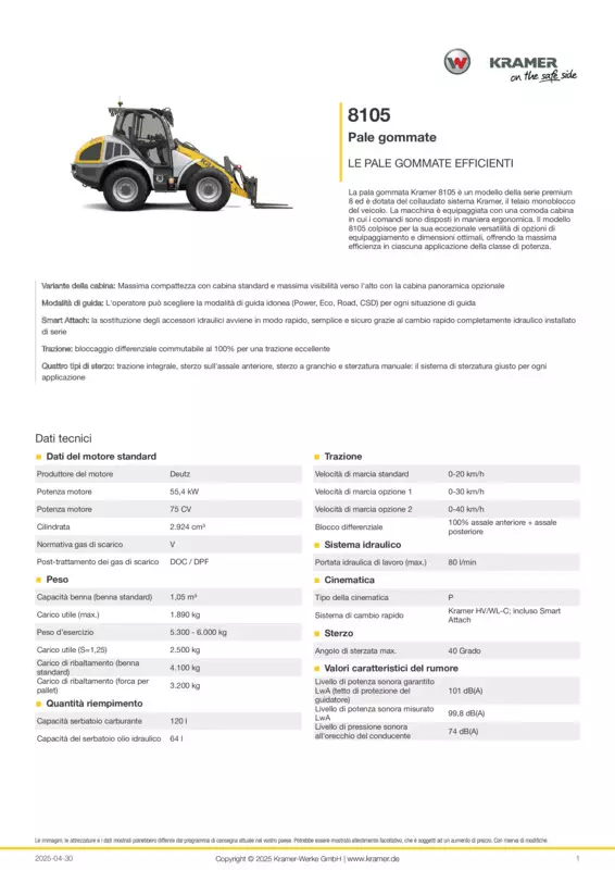 La pala gommata Kramer 8105 è un modello della serie premium 8 ed è dotata del collaudato sistema Kramer, il telaio monoblocco del veicolo. La macchina è equipaggiata con una comoda cabina in cui i comandi sono disposti in maniera ergonomica. Il modello 8105 colpisce per la sua eccezionale versatilità di opzioni di equipaggiamento e dimensioni ottimali, offrendo la massima efficienza in ciascuna applicazione della classe di potenza.