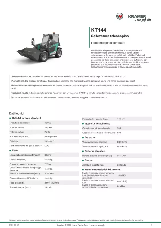 I dati relativi alla potenza del KT144 sono impressionanti nonostante le sue dimensioni ridotte. Il carico utile di sollevamento sulla forca per pallet è di 1.450 kg, l'altezza di sollevamento è di 4,5 m. Anche durante la manipolazione di merci pesanti (ad es. balle di insilato), c'è una riserva sufficiente per lavorare con un ampio sbraccio. L’efficiente macchina convince grazie alla sua trazione dinamica, l'elevato carico utile, l'imbattibile maneggevolezza e il peso operativo ridotto.