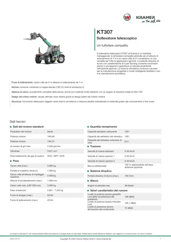 Il sollevatore telescopico KT307 di Kramer è un tuttofare maneggevole: le dimensioni compatte abbinate ad un'altezza di sollevamento di 7 m e un carico utile di 3 t consentono un uso versatile per tutte le applicazioni agricole. La potente idraulica di lavoro con caratteristiche di Load Sensing consente movimenti precisi e sovrapposti e garantisce un'elevata produttività nell'azienda agricola. La trazione idrostatica continua e accessi per la manutenzione progettati in modo intelligente facilitano l'uso e la manutenzione quotidiana.