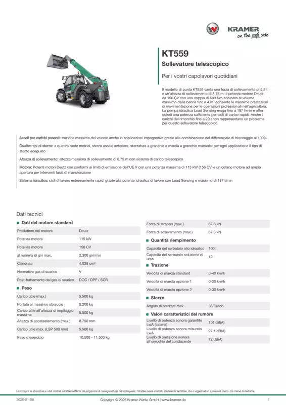 Il modello di punta KT559 vanta una forza di sollevamento di 5,5 t e un'altezza di sollevamento di 8,75 m. Il potente motore Deutz da 156 CV con una coppia di 609 Nm abbinato al volume massimo della benna fino a 4 m³ consente le massime prestazioni di movimentazione per le operazioni professionali nell’agricoltura. La pompa idraulica Load Sensing eroga fino a 187 l/min e offre quindi una potenza sufficiente per cicli di carico rapidi. Anche i carichi del rimorchio fino a 20 t non rappresentano un problema per questo sollevatore telescopico.