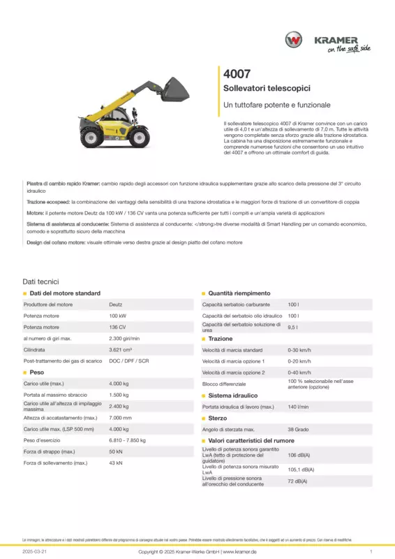 Il sollevatore telescopico 4007 di Kramer convince con un carico utile di 4,0 t e un'altezza di sollevamento di 7,0 m. Tutte le attività vengono completate senza sforzo grazie alla trazione idrostatica. La cabina ha una disposizione estremamente funzionale e comprende numerose funzioni che consentono un uso intuitivo del 4007 e offrono un ottimale comfort di guida.