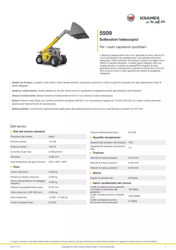 L'altezza di sollevamento fino a 9 m abbinata al carico utile di 5,5 t sono gli elementi che caratterizzano il più grande sollevatore telescopico 5509 di Kramer. Per essere in grado di svolgere lavori difficili in maniera efficiente, il motore Deutz integrato offre una coppia elevata e il cambio ecospeedPRO integrato di serie garantisce lavoro confortevole a velocità di marcia fino a 40 km/h. Cicli di lavoro sicuri e veloci garantiti dai sistemi di assistenza intelligenti.