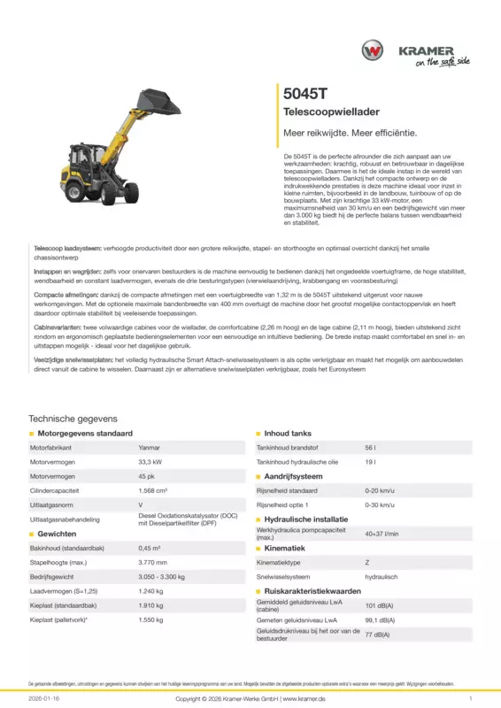 De 5045T is de perfecte allrounder die zich aanpast aan uw werkzaamheden: krachtig, robuust en betrouwbaar in dagelijkse toepassingen. Daarmee is het de ideale instap in de wereld van telescoopwielladers. Dankzij het compacte ontwerp en de indrukwekkende prestaties is deze machine ideaal voor inzet in kleine ruimten, bijvoorbeeld in de landbouw, tuinbouw of op de bouwplaats. Met zijn krachtige 33 kW-motor, een maximumsnelheid van 30 km/u en een bedrijfsgewicht van meer dan 3.000 kg biedt hij de perfecte balans tussen wendbaarheid en stabiliteit.