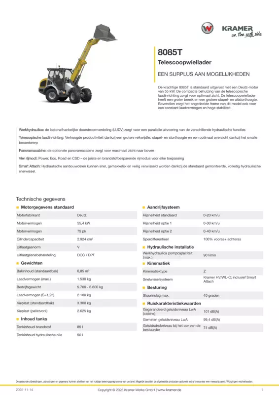 De krachtige 8085T is standaard uitgerust met een Deutz-motor van 55 kW. De compacte behuizing van de telescopische laadinrichting zorgt voor optimaal zicht. De telescoopwiellader heeft een groter bereik en een grotere stapel- en uitstorthoogte. Bovendien zorgt het ongedeelde frame van dit model ook voor een constant laadvermogen en hoge stabiliteit.