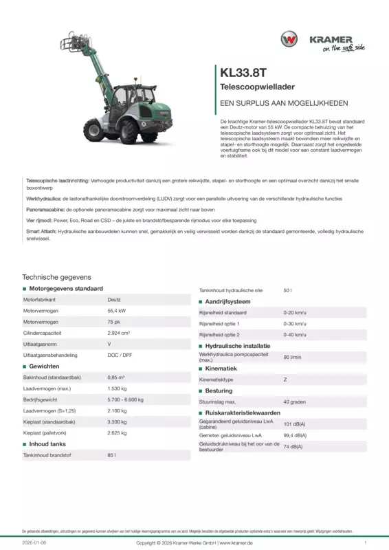 De krachtige Kramer-telescoopwiellader KL33.8T bevat standaard een Deutz-motor van 55 kW. De compacte behuizing van het telescopische laadsysteem zorgt voor optimaal zicht. Het telescopische laadsysteem maakt bovendien meer reikwijdte en stapel- en storthoogte mogelijk. Daarnaast zorgt het ongedeelde voertuigframe ook bij dit model voor een constant laadvermogen en stabiliteit.