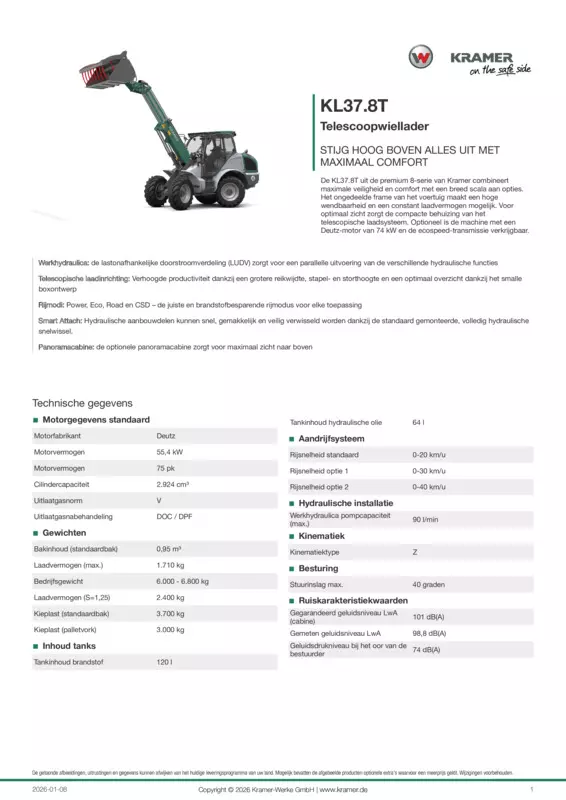 De KL37.8T uit de premium 8-serie van Kramer combineert maximale veiligheid en comfort met een breed scala aan opties. Het ongedeelde frame van het voertuig maakt een hoge wendbaarheid en een constant laadvermogen mogelijk. Voor optimaal zicht zorgt de compacte behuizing van het telescopische laadsysteem. Optioneel is de machine met een Deutz-motor van 74 kW en de ecospeed-transmissie verkrijgbaar.