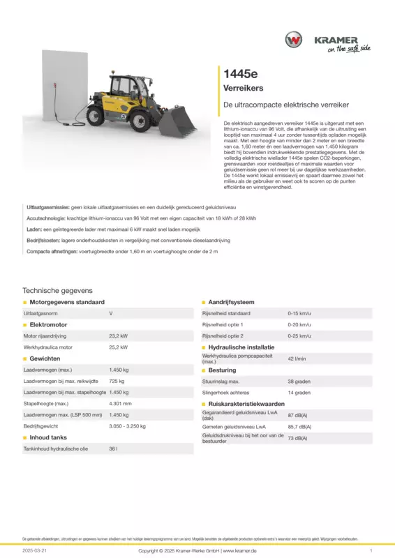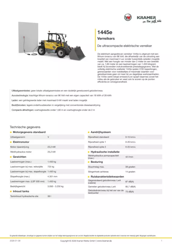 De elektrisch aangedreven verreiker 1445e is uitgerust met een lithium-ionaccu van 96 Volt, die afhankelijk van de uitrusting een looptijd van maximaal 4 uur zonder tussentijds opladen mogelijk maakt. Met een hoogte van minder dan 2 meter en een breedte van ca. 1,60 meter én een laadvermogen van 1.450 kilogram biedt hij bovendien indrukwekkende prestatiegegevens. Met de volledig elektrische wiellader 1445e spelen CO2-beperkingen, grenswaarden voor roetdeeltjes of maximale waarden voor geluidsemissie geen rol meer bij uw dagelijkse werkzaamheden. De 1445e werkt lokaal emissievrij en spaart daarmee zowel het milieu als de gebruiker en weet ook te scoren op de punten efficiëntie en winstgevendheid.