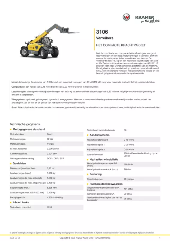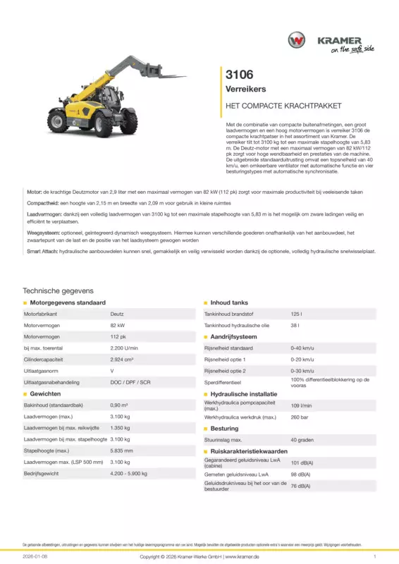 Met de combinatie van compacte buitenafmetingen, een groot laadvermogen en een hoog motorvermogen is verreiker 3106 de compacte krachtpatser in het assortiment van Kramer. De verreiker tilt tot 3100 kg tot een maximale stapelhoogte van 5,83 m. De Deutz-motor met een maximaal vermogen van 82 kW/112 pk zorgt voor hoge wendbaarheid en prestaties van de machine. De uitgebreide standaarduitrusting omvat een topsnelheid van 40 km/u, een omkeerbare ventilator met automatische functie en vier besturingstypes met automatische synchronisatie.