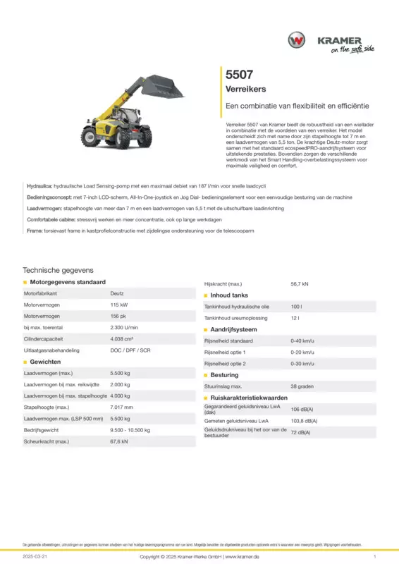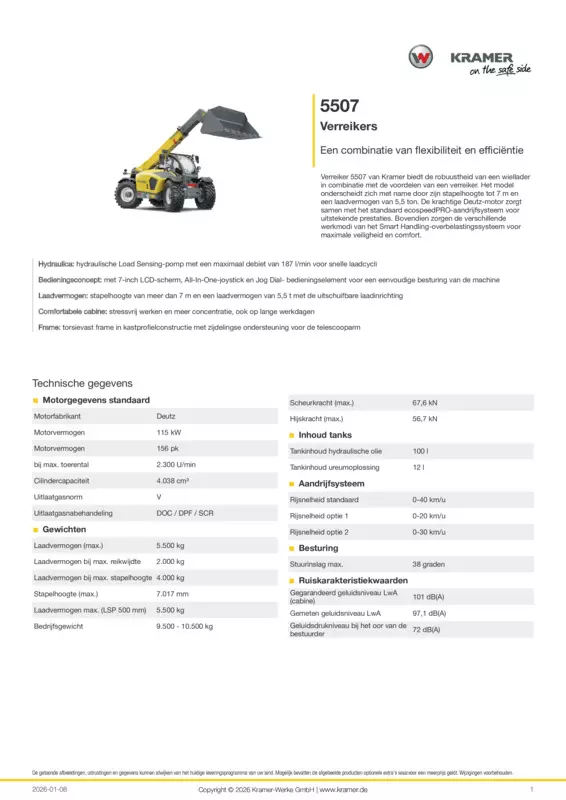 Verreiker 5507 van Kramer biedt de robuustheid van een wiellader in combinatie met de voordelen van een verreiker. Het model onderscheidt zich met name door zijn stapelhoogte tot 7 m en een laadvermogen van 5,5 ton. De krachtige Deutz-motor zorgt samen met het standaard ecospeedPRO-aandrijfsysteem voor uitstekende prestaties. Bovendien zorgen de verschillende werkmodi van het Smart Handling-overbelastingssysteem voor maximale veiligheid en comfort.