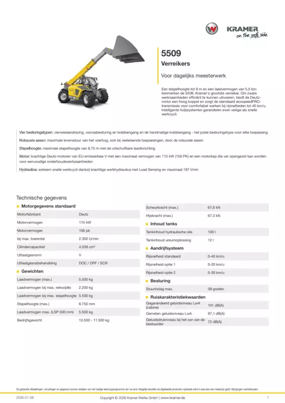 Een stapelhoogte tot 9 m en een laadvermogen van 5,5 ton kenmerken de 5509, Kramer's grootste verreiker. Om zware werkzaamheden efficiënt te kunnen uitvoeren, biedt de Deutz-motor een hoog koppel en zorgt de standaard ecospeedPRO-transmissie voor comfortabel werken bij rijsnelheden tot 40 km/u. Intelligente hulpsystemen garanderen even veilige als snelle werkcycli.