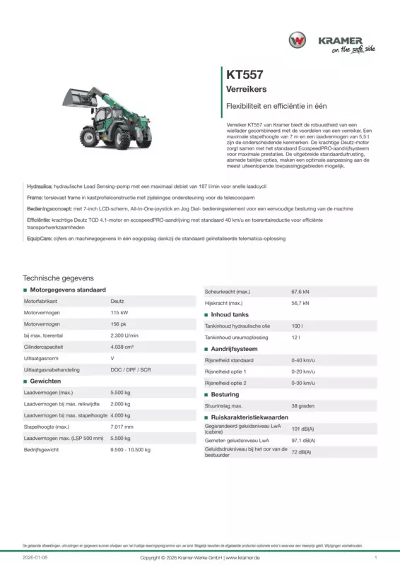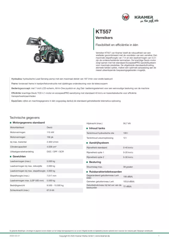 Verreiker KT557 van Kramer biedt de robuustheid van een wiellader gecombineerd met de voordelen van een verreiker. Een maximale stapelhoogte van 7 m en een laadvermogen van 5,5 t zijn de onderscheidende kenmerken. De krachtige Deutz-motor zorgt samen met het standaard EcospeedPRO-aandrijfsysteem voor maximale prestaties. De uitgebreide standaarduitrusting, alsmede talrijke opties, maken een optimale aanpassing aan de meest uiteenlopende toepassingsgebieden mogelijk.