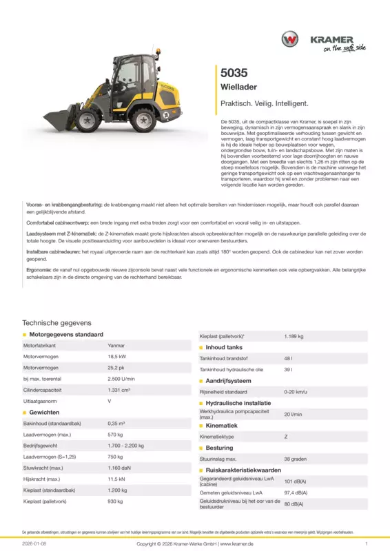 De 5035, uit de compactklasse van Kramer, is soepel in zijn beweging, dynamisch in zijn vermogensaanspraak en slank in zijn bouwwijze. Met geoptimaliseerde verhouding tussen gewicht en vermogen, laag transportgewicht en constant hoog laadvermogen is hij de ideale helper op bouwplaatsen voor wegen, ondergrondse bouw, tuin- en landschapsbouw. Met zijn maten is hij bovendien voorbestemd voor lage doorrijhoogten en nauwe doorgangen. Met een breedte van slechts 1,26 m zijn ritten op de stoep moeiteloos mogelijk. Bovendien is de machine vanwege het geringe transportgewicht ook op een vrachtwagenaanhanger te transporteren, waardoor hij snel en zonder problemen naar een volgende locatie kan worden gereden.
