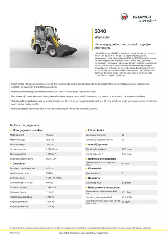 Het wielladermodel 5040 is standaard uitgerust met een Yanmar-motor van 28,5 kW / 38,8 pk. De nabehandeling van de uitlaatgassen vindt plaats via een DOC en DPF. Bovendien is voor de vierwielgestuurde wiellader Smart Driving PRO optioneel verkrijgbaar. Hierbij gaat het om een functie met drie verschillende rijmodi, die de bestuurder in de desbetreffende toepassingen ondersteunen, ontlasten en bovendien brandstofbesparend zijn. In combinatie met de bescheiden breedte van 1,26 m is de 5040 daarmee de ideale keuze voor de wegenbouw, ondergrondse bouw, tuin- en landschapsbouw.