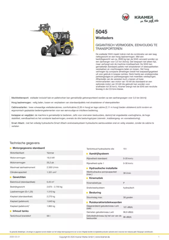 De wiellader 5045 maakt indruk met de combinatie van een laag nettogewicht en een hoog laadvermogen. Met een bedrijfsgewicht van ca. 2600 kg kan de 5045 vervoerd worden op een aanhanger voor 3,5 ton (tolvrij). Dat bespaart niet alleen tijd, maar verhoogt ook de machine-inzetbaarheid. De 5045 kan gemakkelijk standaard pallets met straatstenen of steenpakketten verplaatsen en vrachtwagens laden en lossen. Het hoog vermogen bij compacte afmetingen breidt het toepassingsgebied uit voor gebruik in krappe ruimtes. Denk hierbij aan ondergrondse parkeergarages en parkeergarages met meerdere verdiepingen. Afhankelijk van de vereisten kunt u kiezen uit twee motorvarianten: een motor van 19 kW als standaard en een optionele motor van 33 kW die gebruikt kan worden voor snelheden tot 30 km/u. Kramer brengt met de 5045 een revolutie teweeg in de 2,8-tons klasse.